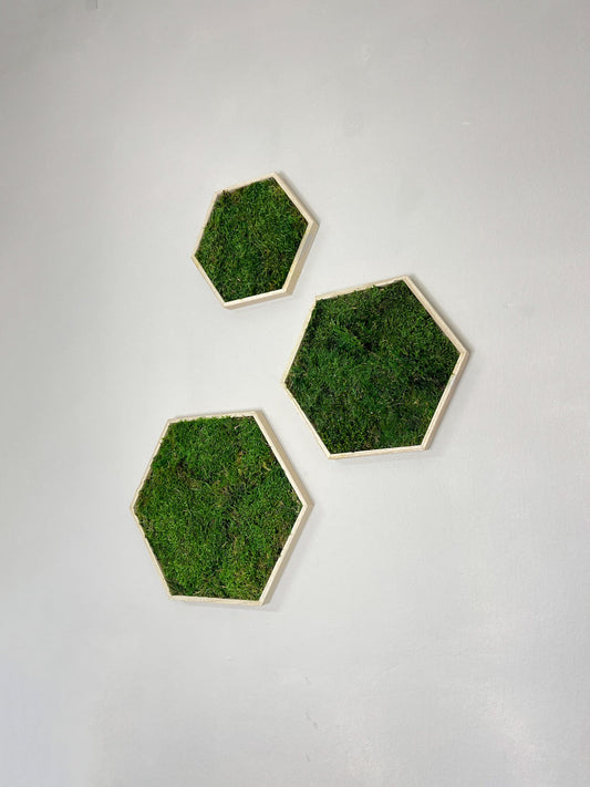 Moosbild Hexagon mit Holz Rahmen Sorte Flachmoos & Ballenmoos Sechseck