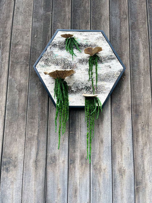 Birkenbild mit Baumpilzen & Ranken Hexagon Rahmen