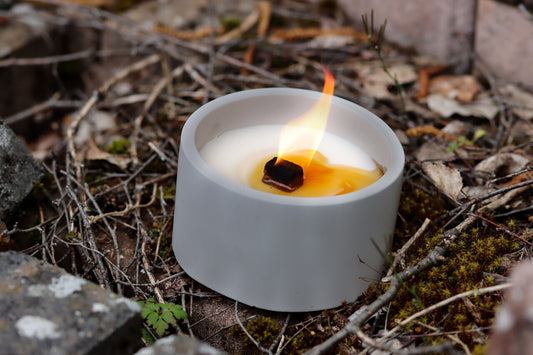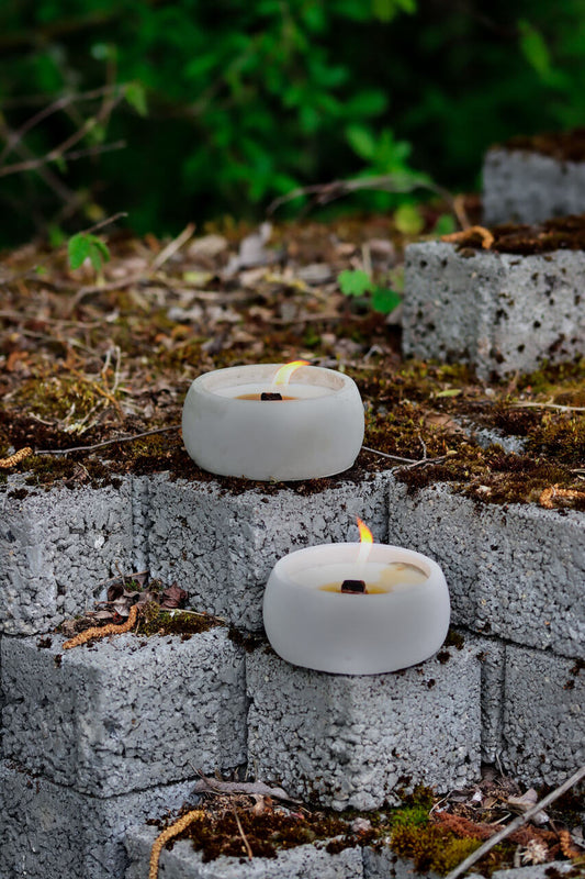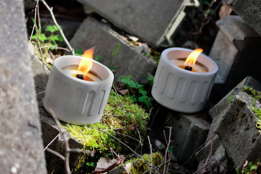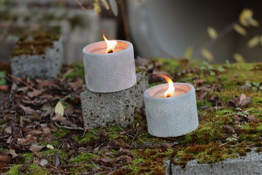2er-Set Beton Outdoor Kerze "Blattfeuer" mit Dauerdocht lange Brenndauer mit Kerzenresten