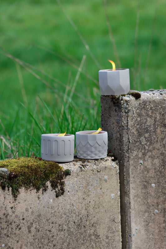 2er-Set Beton Outdoor Kerze "Ornament Feuer" mit Dauerdocht lange Brenndauer mit Kerzenresten