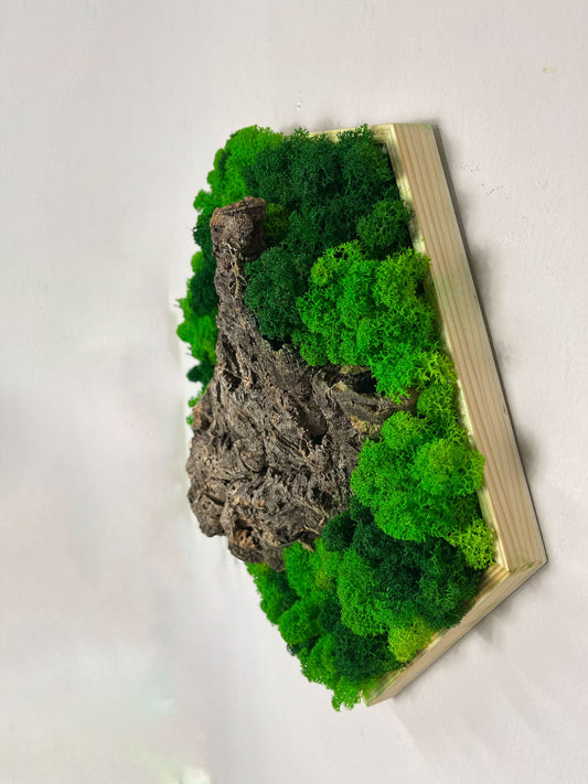 Moosbild Hügelmoos & Ast Hexagon Rahmen Ballenmoos Sechseck